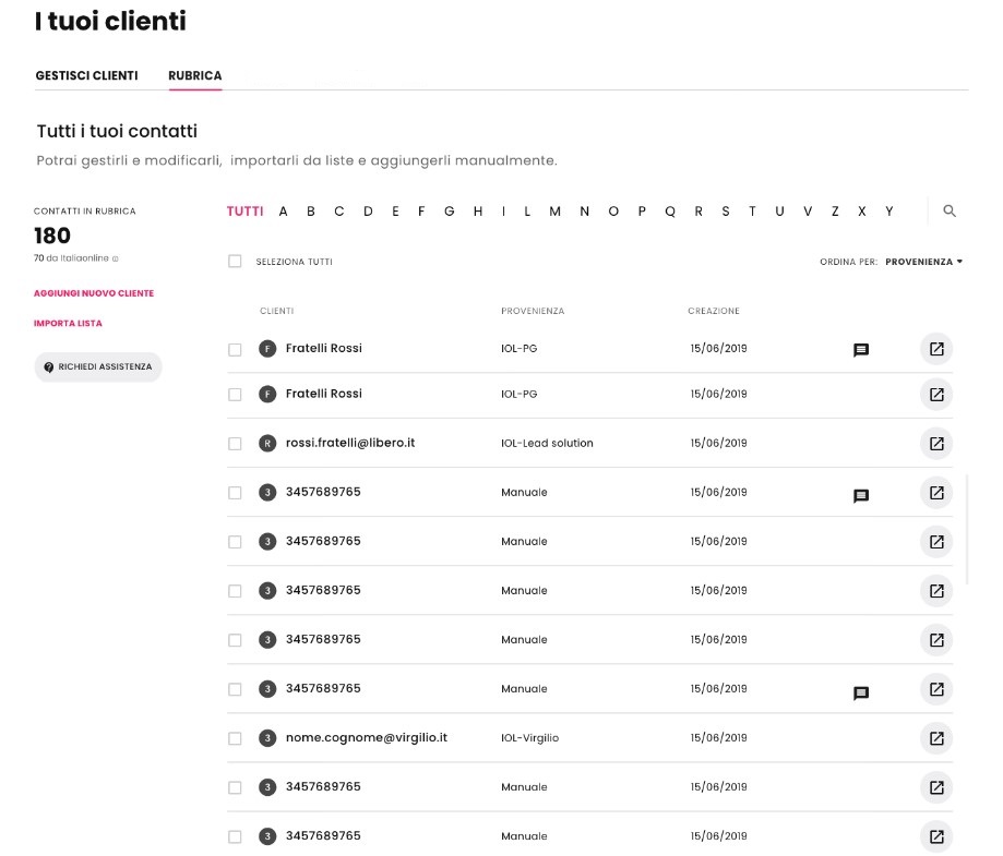 In questa sezione trovi l’elenco di tutti i contatti che sono stati importati automaticamente o manualmente, insieme ai principali dati come per esempio: nome, cognome, provenienza (nel momento in cui è stata realizzata un’importazione automatica, troverai anche il prodotto che ha generato il contatto) e data di caricamento.