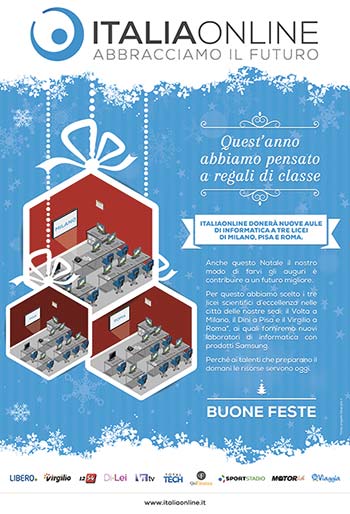 In linea con il payoff “Abbracciamo il futuro”, Italiaonline ha voluto pensare ai giovani e donerà tre aule di informatica ad altrettanti licei scientifici d’eccellenza: il Volta a Milano, il Dini a Pisa e il Virgilio a Roma, le tre città dove il gruppo ha sede.