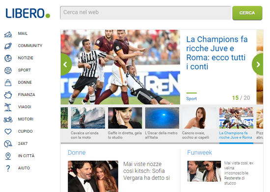 Lo slider centrale che ospita le notizie principali è a 20 posizioni, navigabili sia sfiorando il singolo strillo che scorrendo il carrello che visualizza le notizie a gruppi di cinque. Sotto lo slider, le notizie sono raggruppate verticalmente per aree tematiche, il cui ordine è in base alle preferenze dell’utente, in modo da favorirlo nella ricerca dei contenuti più graditi. In spalla sinistra, la nuova home page di Libero ospita un menu leggero composto dai principali servizi e portali verticali.