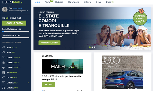 È stata introdotta anche una sidebar per avere in un solo colpo d’occhio l’elenco di tutti i servizi di Libero, con l’indicazione di quelli attivi, nonché un entry point facilitato verso di essi. Ora, quindi, gli utenti Libero Mail possono servirsi “al volo” di tutte le utilities offerte dal mondo di Libero: non soltanto JumboMail per inviare file di cospicue dimensioni oppure il Drive virtuale per salvare allegati e file personali, ma anche i giochi di Libero Gioco e LiberoFun, le offerte di Libero Cashback e di Libero Shopping o ancora le funzionalità di Libero Pay, che permette agli utenti della Libero Mail di pagare online una serie di servizi di utilità, dai bollettini ai servizi pagoPA e molto altro ancora.