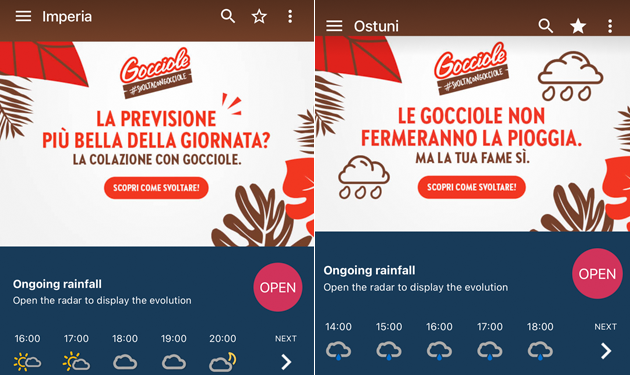 Il formato scelto è il “Cover + Native”, che si integra naturalmente nel contesto editoriale dell’app di 3BMeteo, sfruttandone al meglio le potenzialità. E’ un formato di grande impatto e permette di declinare le creatività pubblicitaria in base alle diverse condizioni meteo per esprimere il claim “da così a così” delle Gocciole Barilla, che esprime un nuovo modo di vedere le cose (e anche la giornata). Il formato “Cover + Native” può essere erogato – e variare – in funzione della situazione metereologica prevista nella località ricercata, ed è un cosiddetto 100% share of page (unico formato in pagina). Inoltre, sarà erogato con limite di frequenza per rispettare la navigazione dei contenuti da parte dell’utente.