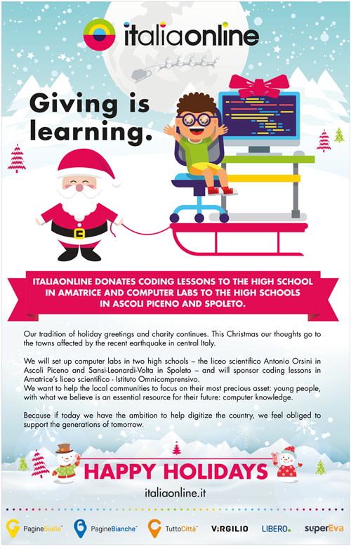 Nel solco di una tradizione ormai pluriennale di vicinanza e sostegno ai giovani e nativi digitali, anche per le feste di fine 2016 Italiaonline ha deciso di donare alle scuole la cifra destinata ai regali natalizi, sostenendo tre licei delle zone del Centro Italia maggiormente colpite dal terremoto dello scorso agosto e da quello di ottobre, con particolare attenzione alle zone dell’epicentro.