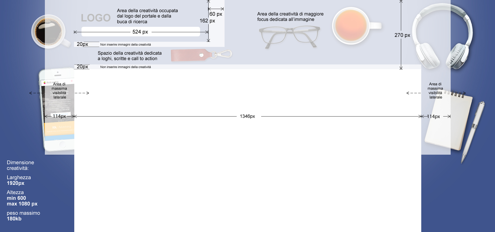 Send creativities by email to advops@italiaonline.it with reference to Italiaonline Sales Account in copy: at least 3 working days before publication. In the subject of the email, please indicate order ID and description (Ex: LB_012345 – Advertiser Name – Product Name – Month/Year): in absence of order ID, indicate the description (see the creativity policy for details).Wallpaper-Special Brand Header specifications